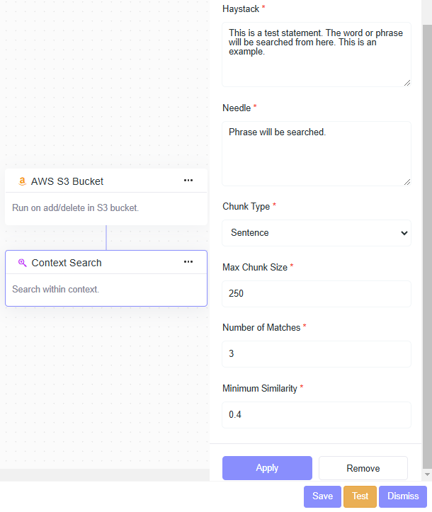 - Haystack: This is a test statement where the word or phrase will be searched.